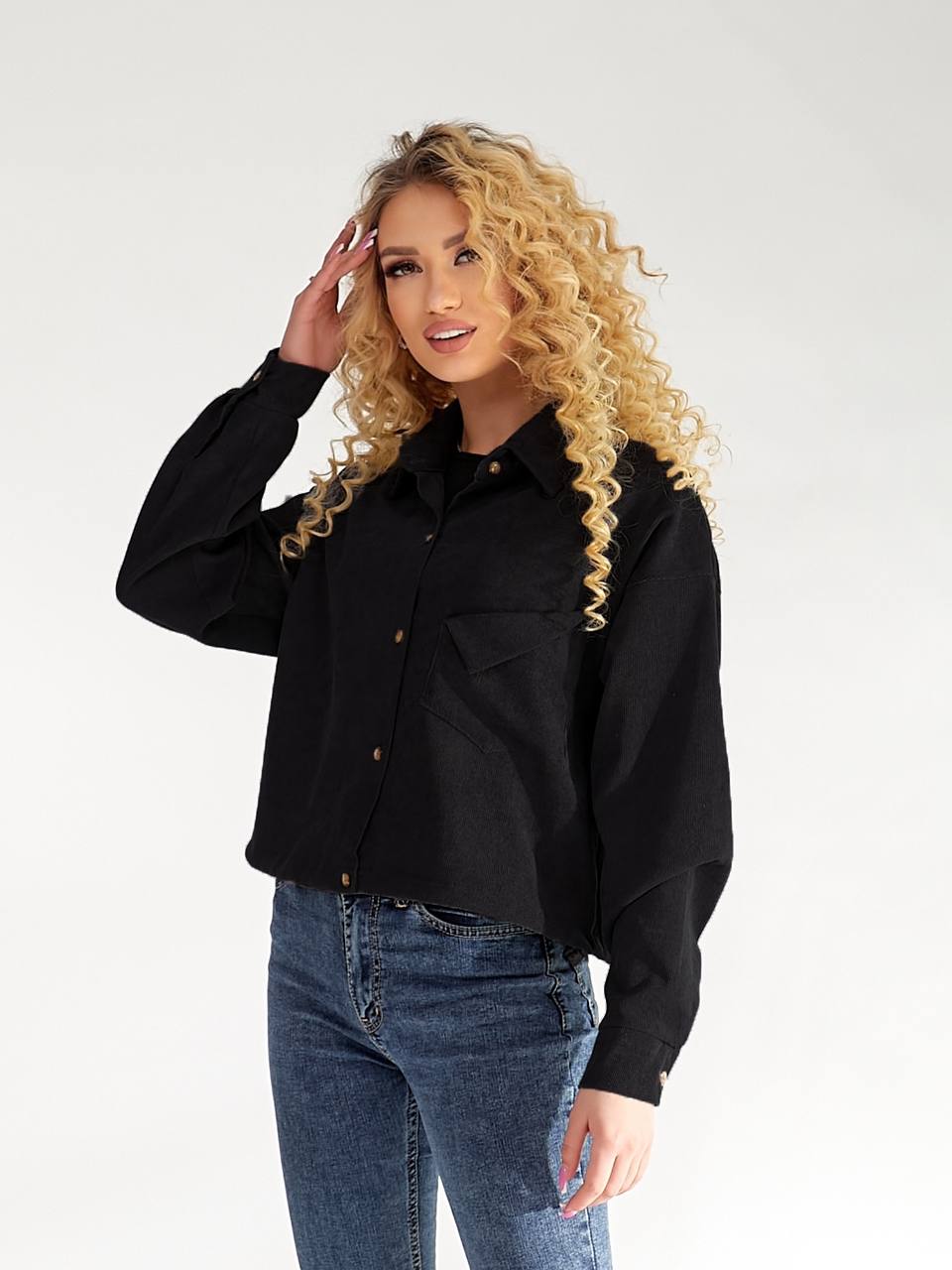 Рубашка укорочена на пуговицах с воротником и декоративным карманом на груди.