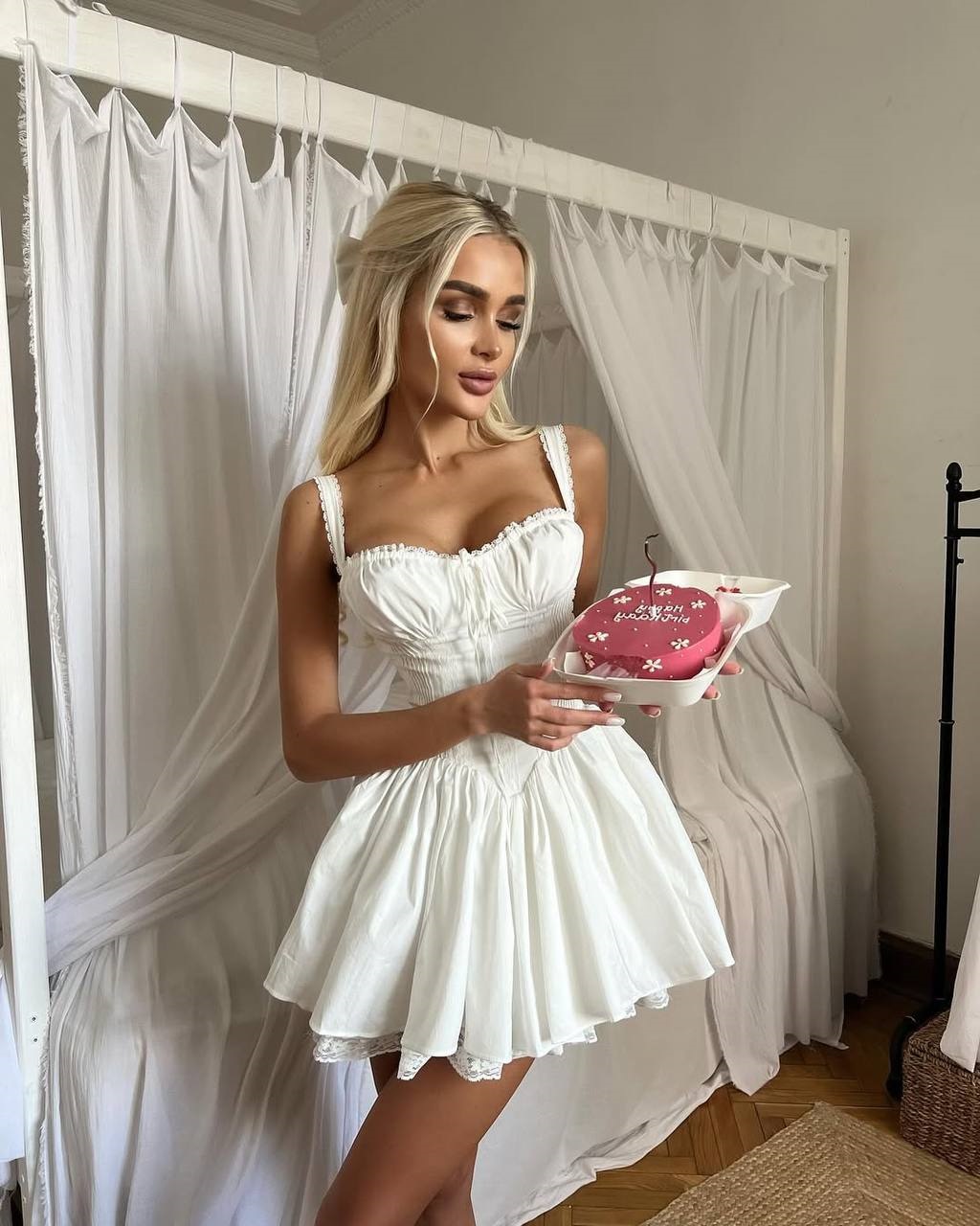 Будьте першим, хто залишив відгук “Сарафан на бретелях с пышной юбкой,украшеной кружевом, белый”“
