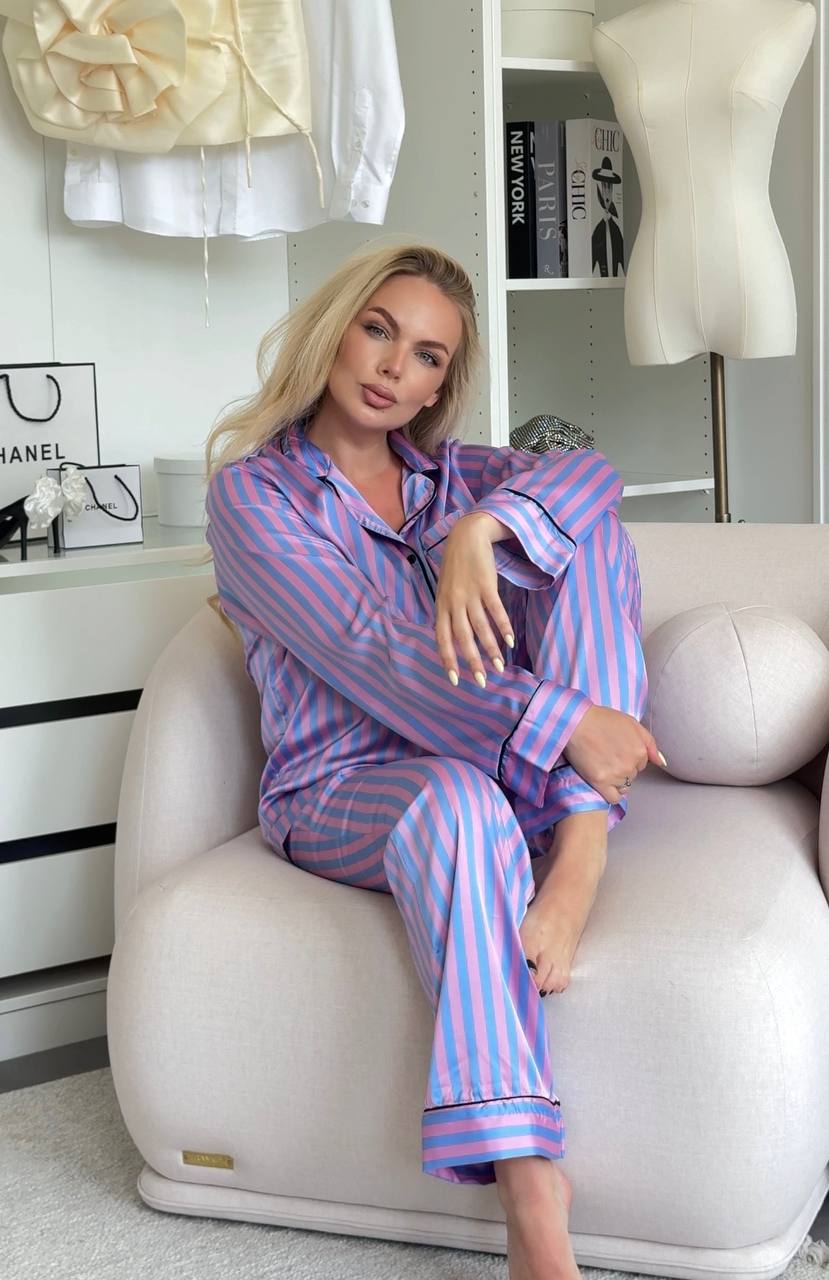 Головна » Магазин » Одяг » Піжама та домашні костюми » Шелковая пижама в полоску (рубашка с небольшим воротником+брюки прямого кроя) голубой