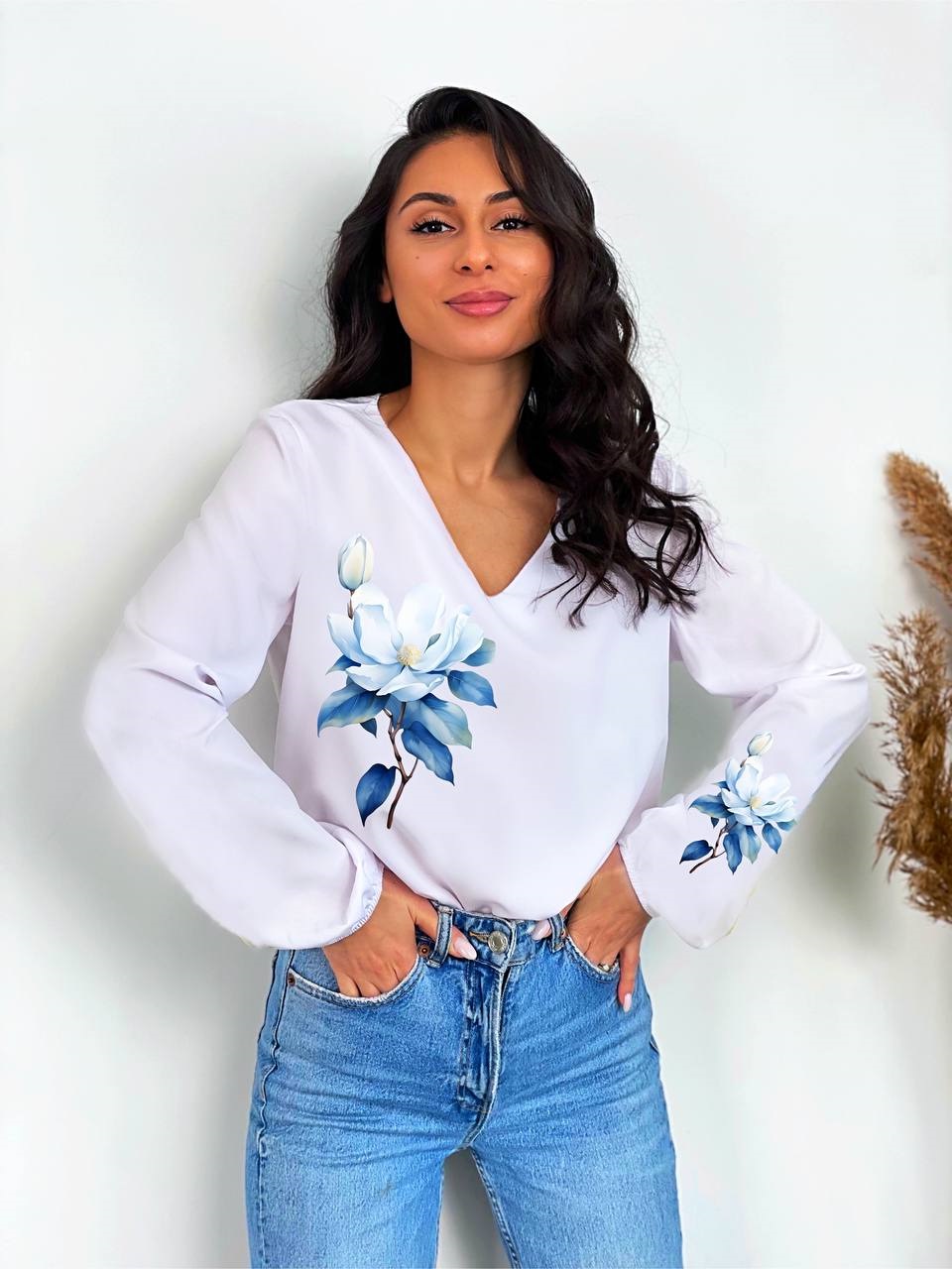 Головна » Магазин » Одяг » Верхнє тіло тіла » Шелковистая блуза с синим цветком белый