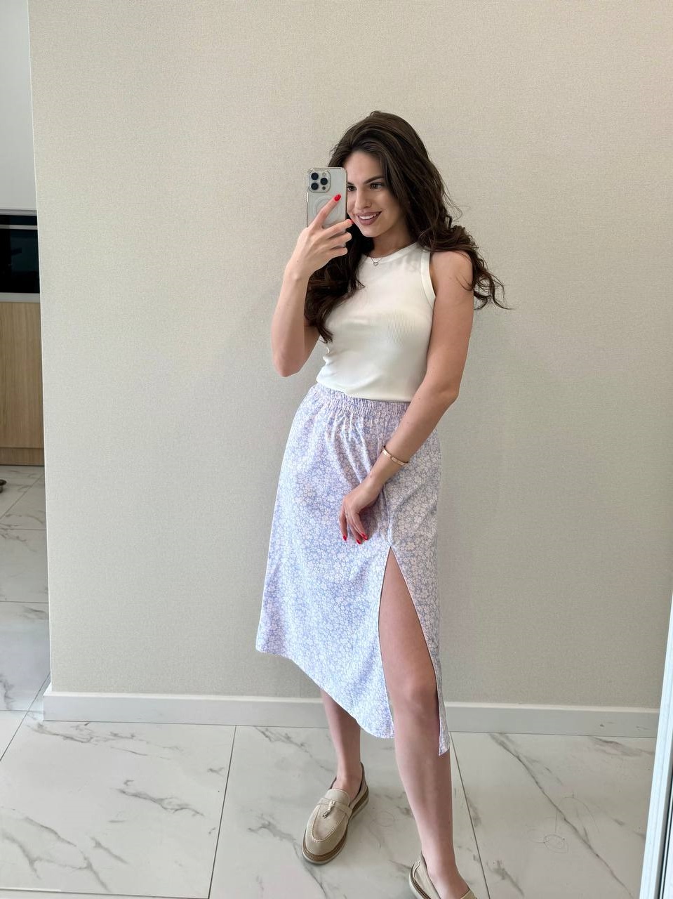 идеальная длина миди и изысканный разрез создают привлекающий внимание образ.