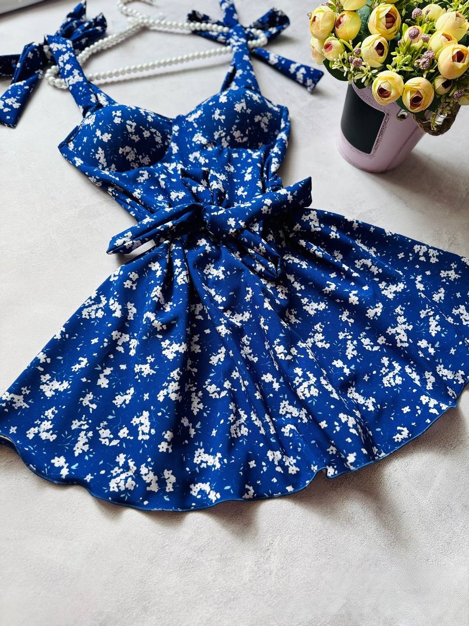 Шелковистое Платье-комбинезон в цветочный принт с бретелями-бантами электрик