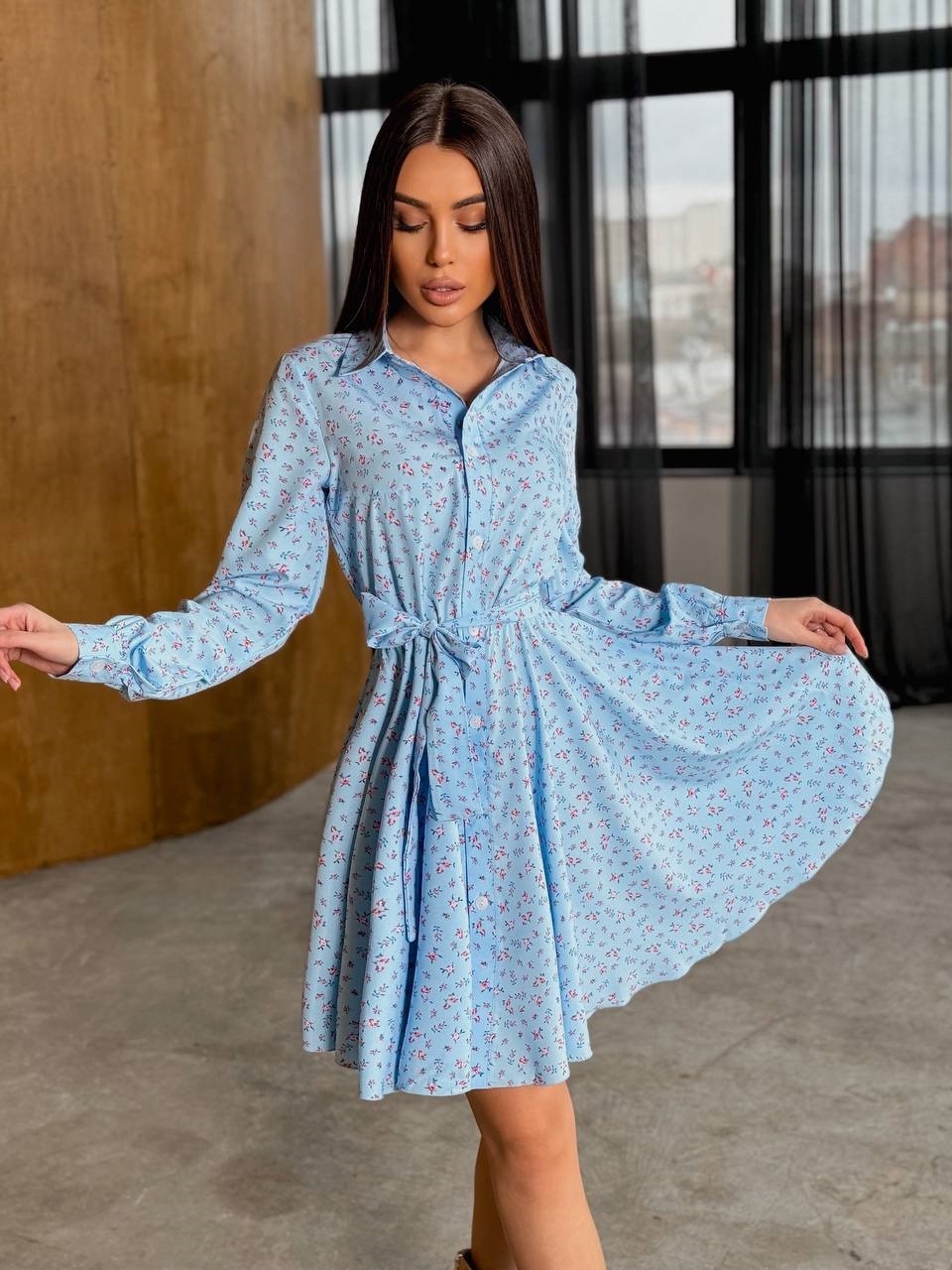 Шелковистое платье на пуговицах с расклешенной юбкой в цветочный принт голубой