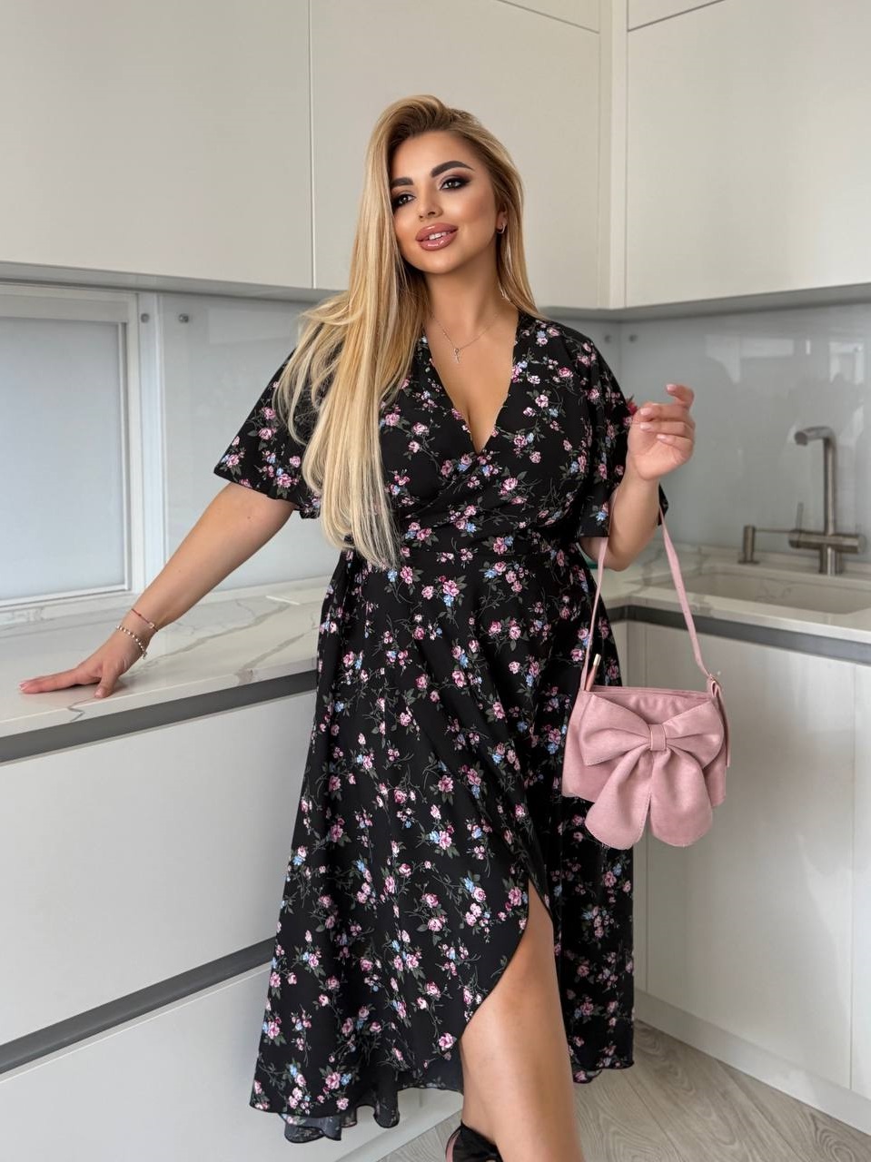 Шелковистое платье на запах с ассиметричным низом в цветочный принт черный