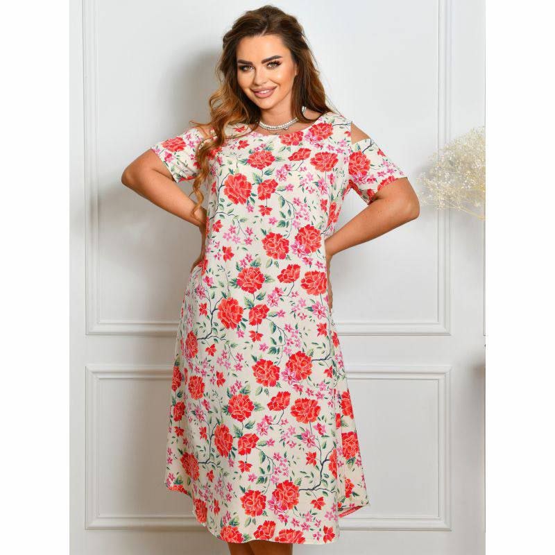 Шелковистое Платье полуприлегающего силуэта с акцентным вырезом на рукавах молочный с цветами