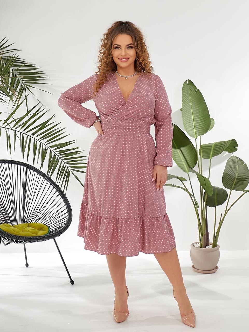 Будьте першим, хто залишив відгук “Шелковистое платье принт мелкий горошек по полочке запах+по талии резинка и волан по юбке фрез”“