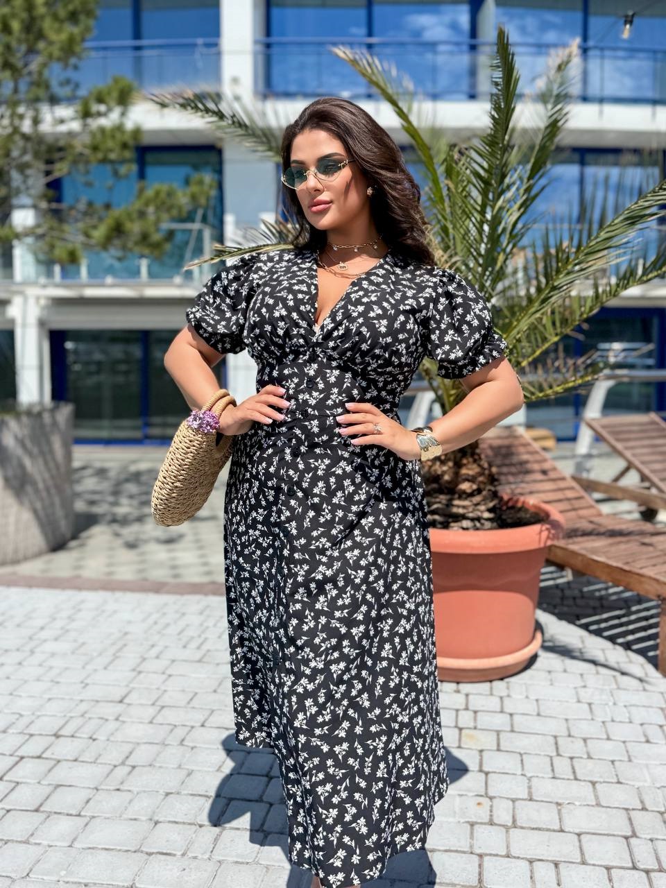 Шелковистое платье приталенного силуэта на пуговицах в цветочный принт черный