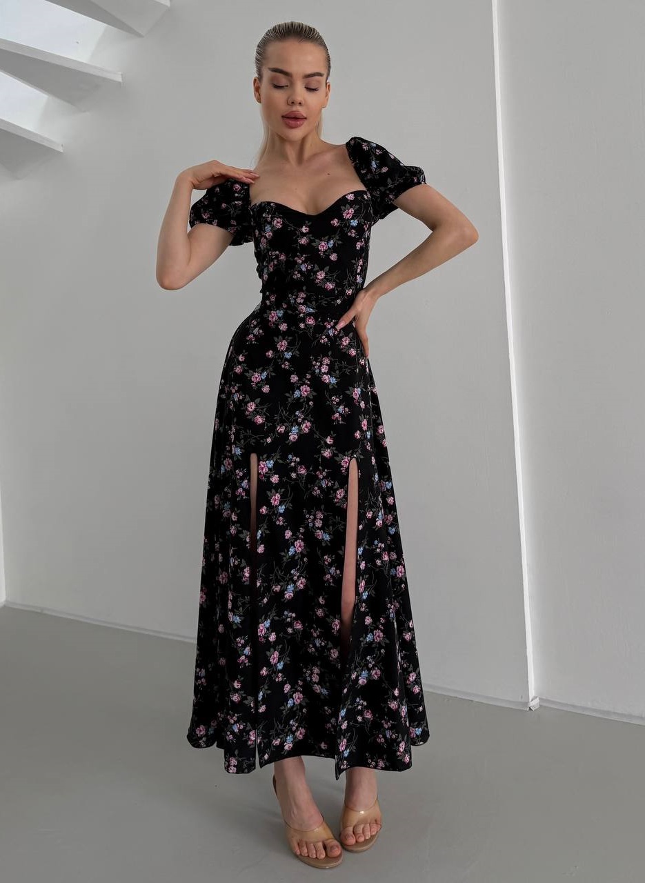 Шелковистое платье в цветочный принт с разрезами по юбке+акцентным лифом черный+розовые цветочки