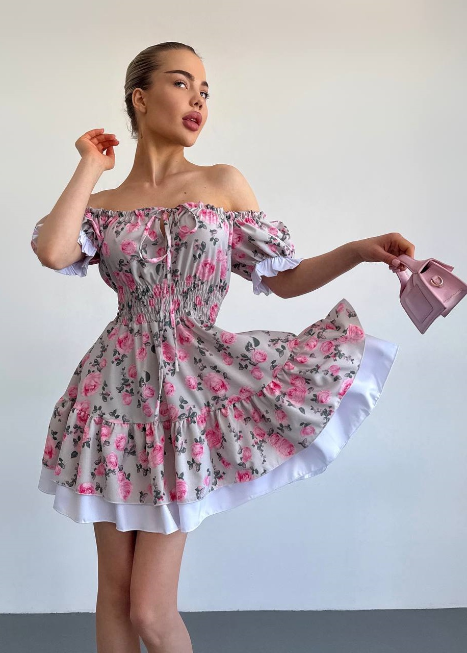 Головна » Магазин » Одяг » Сукня туніка сарафані » Шелковистое платье в цветочный принт с воланом на юбке+открытыми плечами серый