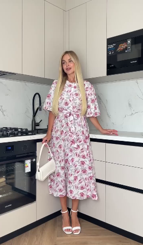 Шелковистое платье в нежных цветах на пуговицах с расклешенной юбкой бело-розовый