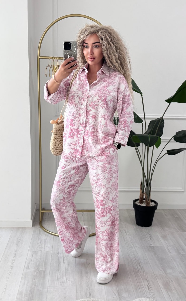 Описание : костюм двойка, брюки палаццо + рубашка свободного кроя, на поясе есть шнурок