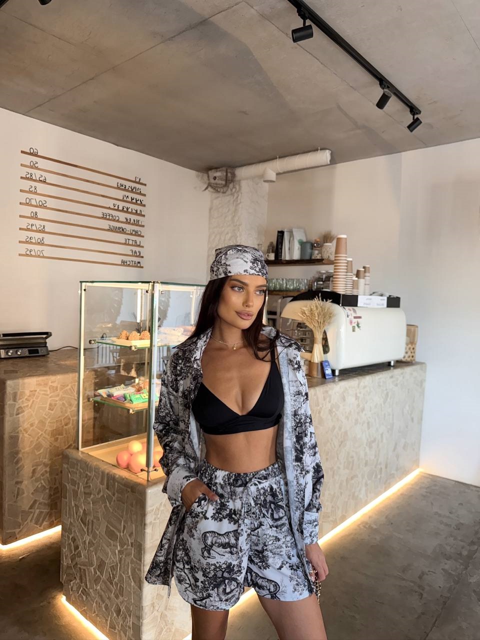 Шелковистый Костюм (рубашка+шорты+бандана) бело-черный