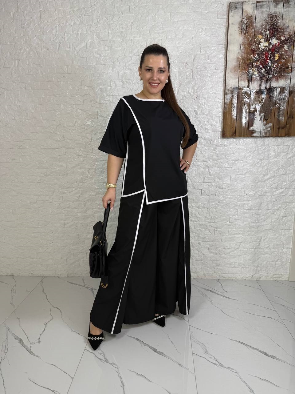 Шелковистый легкий Костюм со вставкой канта (брюки клеш по переду внахлест+блуза) черный