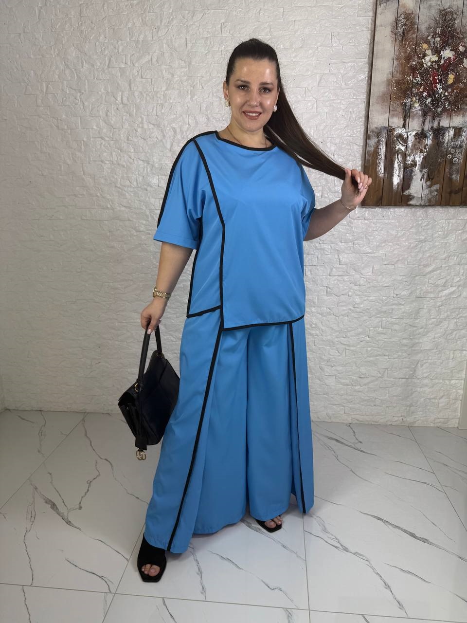 Костюм-двойка интересного кроя: брюки имитация юбки,блуза и брюки обработанные кантом,