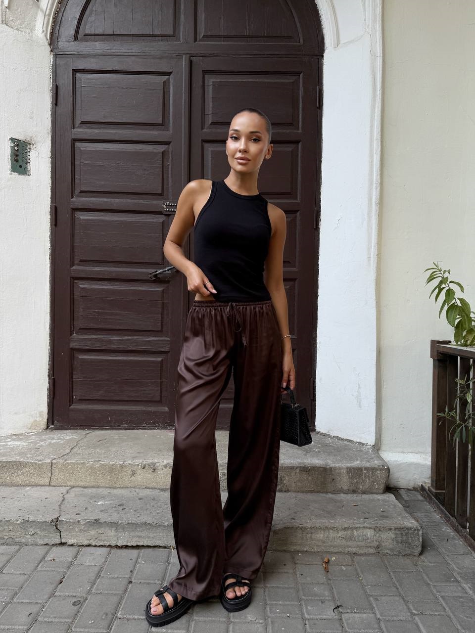 Свободный крой брюк придает непринужденность, а пояс на резинке с завязками обеспечивает комфортную посадку.