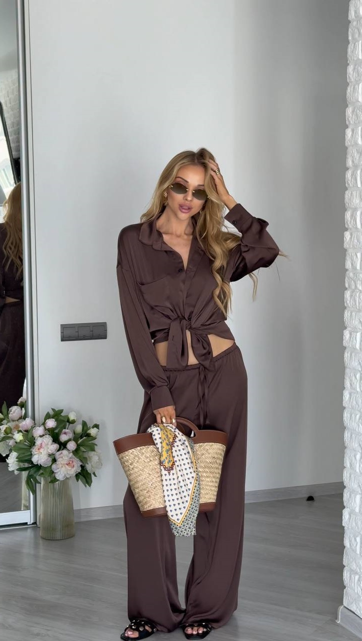 Шелковый костюм (рубашка с длинными рукавами+брюки свободного кроя) шоколад
