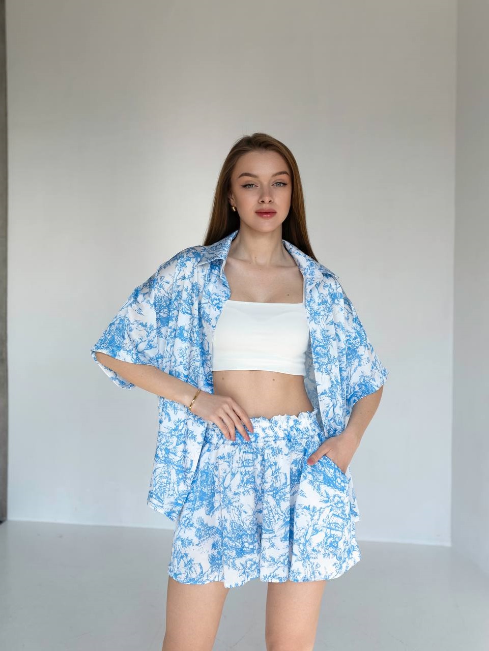 Головна » Магазин » Одяг » Жіночі костюми » Шелковый костюм (рубашка+шорты с карманами) голубой