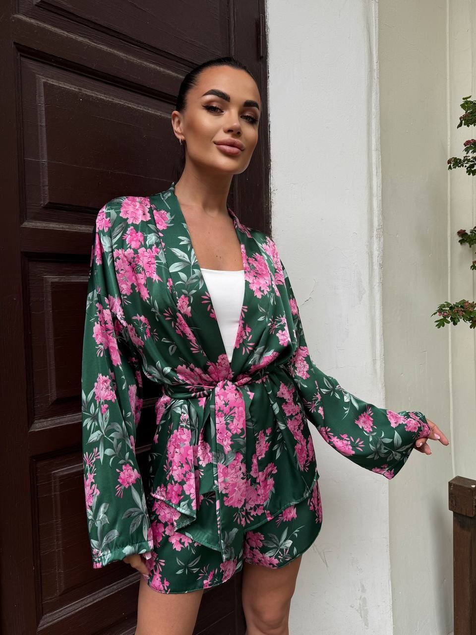 Шелковый Костюм (шорты+кимоно) цветочный принт зеленый