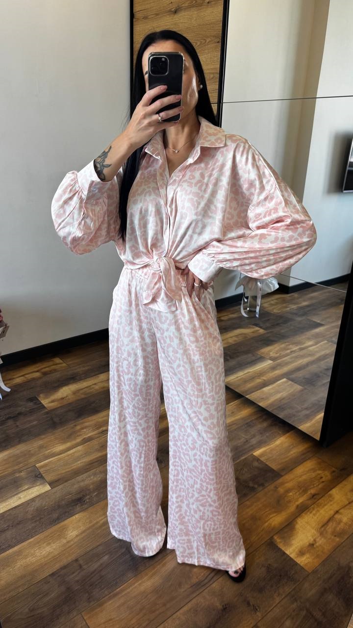 Шелковый Костюм тройка (широкие брюки+рубашка свободногокроя+платок) принт лео пудра