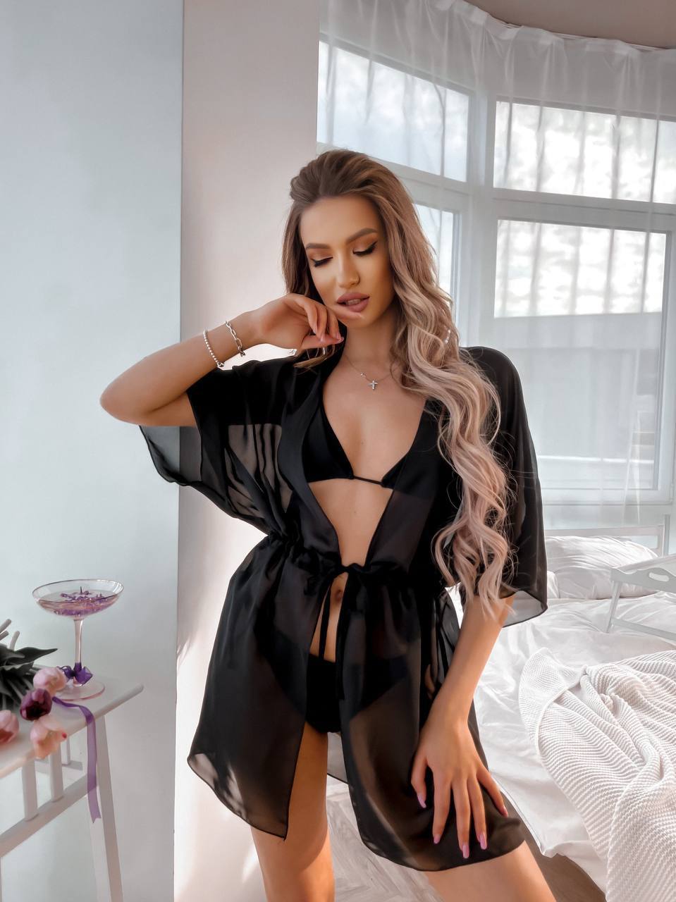 Шифоновая туника мини на затяжке черный