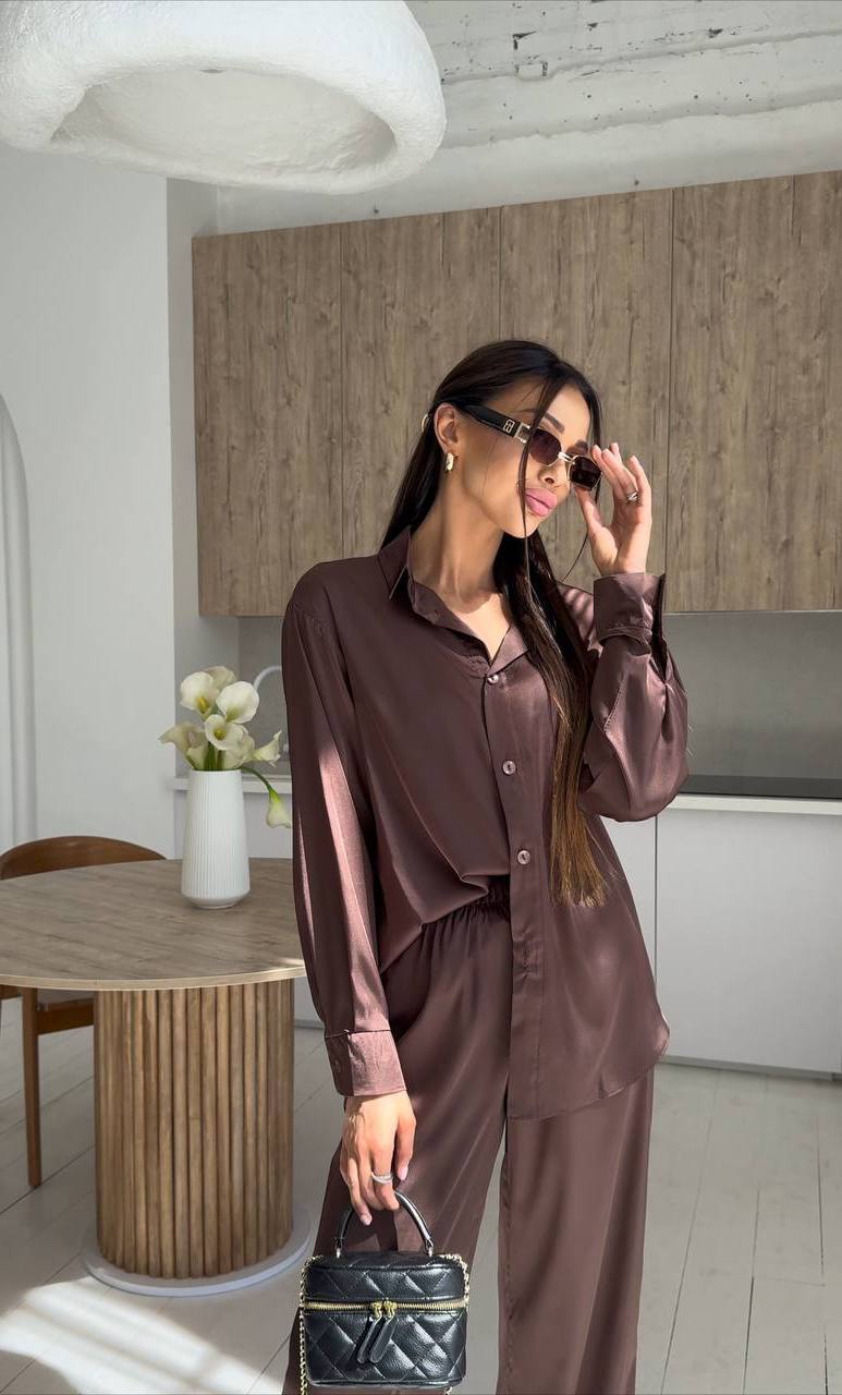Шикарный шелковый костюм (рубашка+свободные брюки) шоколад