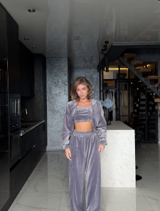 Шикарный велюровый костюм (топ+укороченная кофта на молнии с капюшоном+свободные брюки) серый