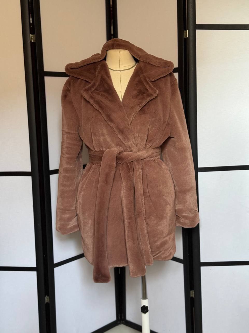 Шубка из экомеха кроля. Капюшон двойной (экохух), не снимается. Застёгивается на 2 пуговицы. Подкладка на 100 синтепонах. Пояс из основания в комплекте. В боковых швах спрятаны карманы.