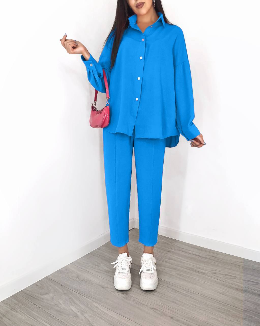 Современный брючный женский костюм (брюки длиной 7/8+свободная рубашка со спущенным плечом) голубой