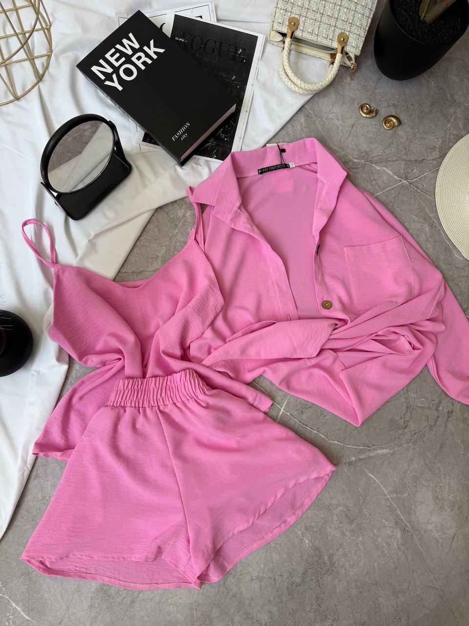 Современный летний костюм (шорты+майка+рубашка с длинным рукавом) креп жатка барби