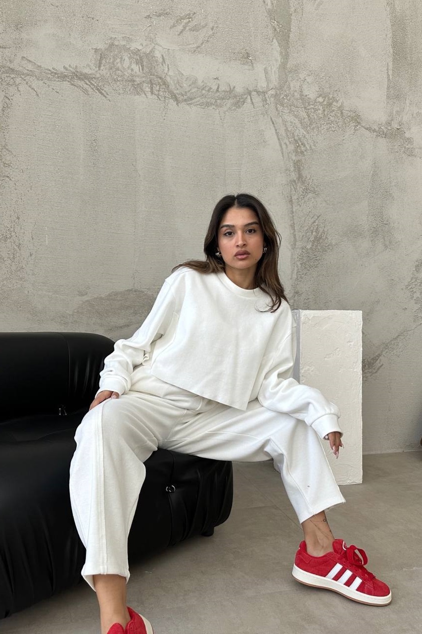 Спорт костюм: укороченное объемное худи с необработанными краями + штаны молоко