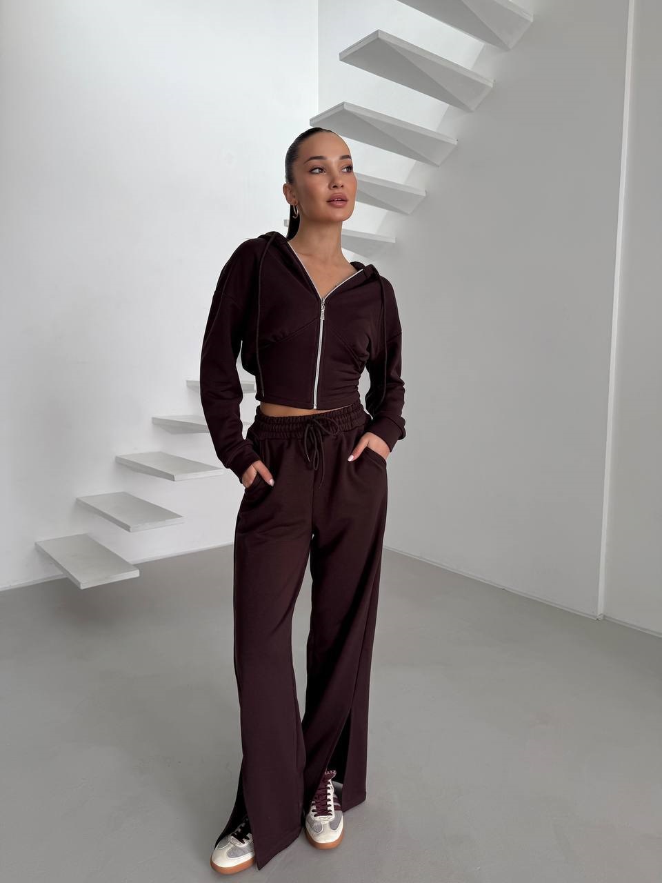 Спортивный костюм (брюки палаццо с разрезом+укороченная кофта на змейке) шоколад
