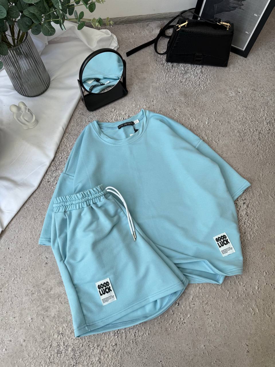 Головна » Магазин » Одяг » Жіночі спортивні костюми » Спортивный костюм двойка: футболка и шорты на шнуровке голубой