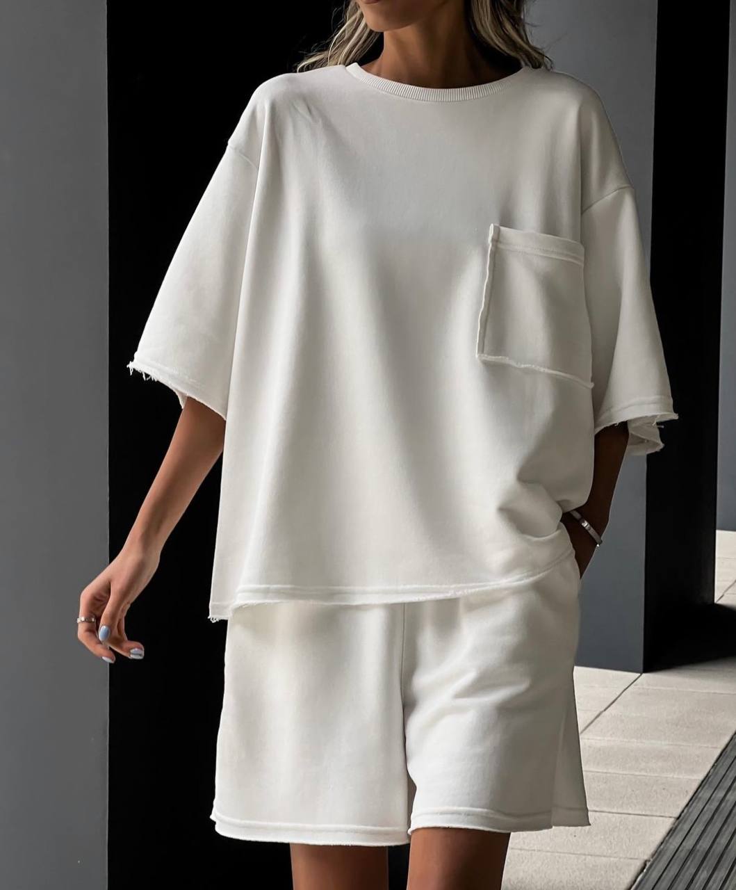 Спортивный костюм двойка: Футболка свободного кроя + шорты (двунитка) молоко