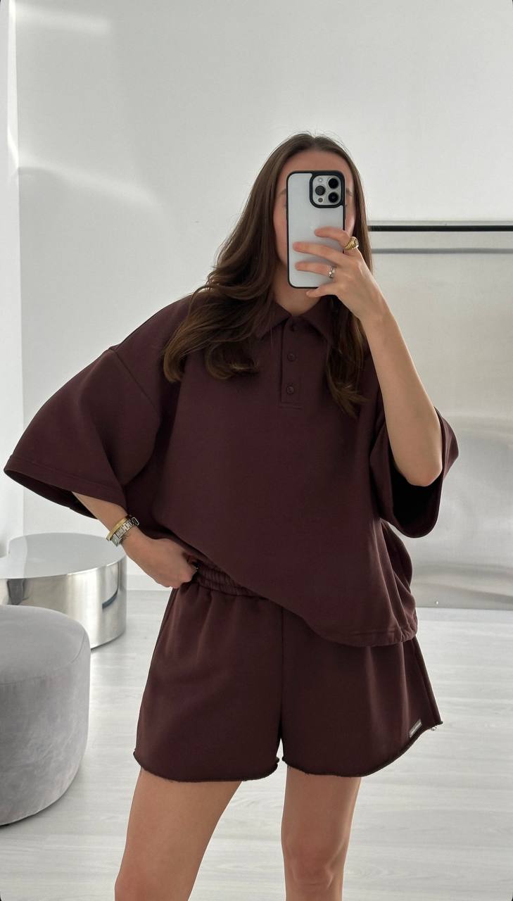 Спортивный костюм двойка: Поло свободного кроя + шорты шоколад