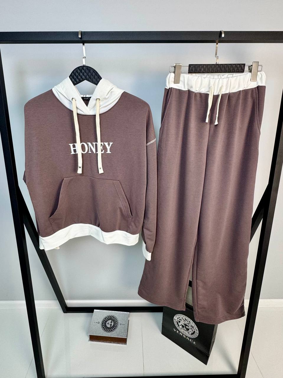 В комплекте худи oversize и брюки-клеш, визуально удлиняющие ноги.