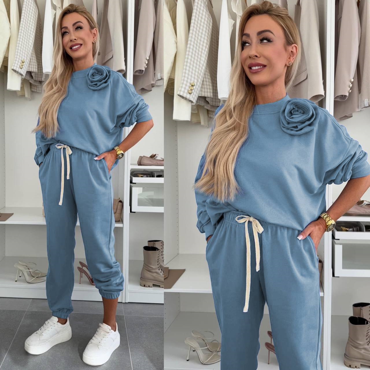 Комплект состоит из свитшота свободного кроя с длинными рукавами, украшенного объемным декоративным цветком на плече,