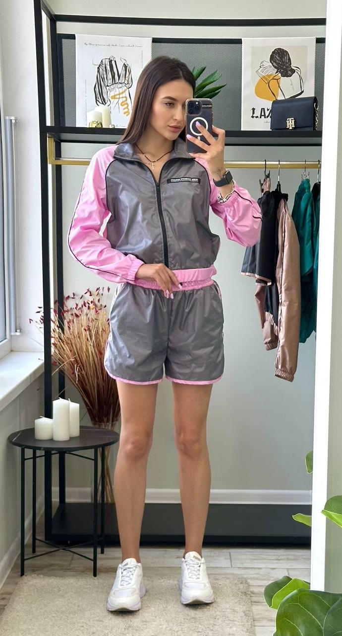 Головна » Магазин » Одяг » Жіночі костюми » Спортивный костюм из плащевки (ветровка+ шорты) серый/барби