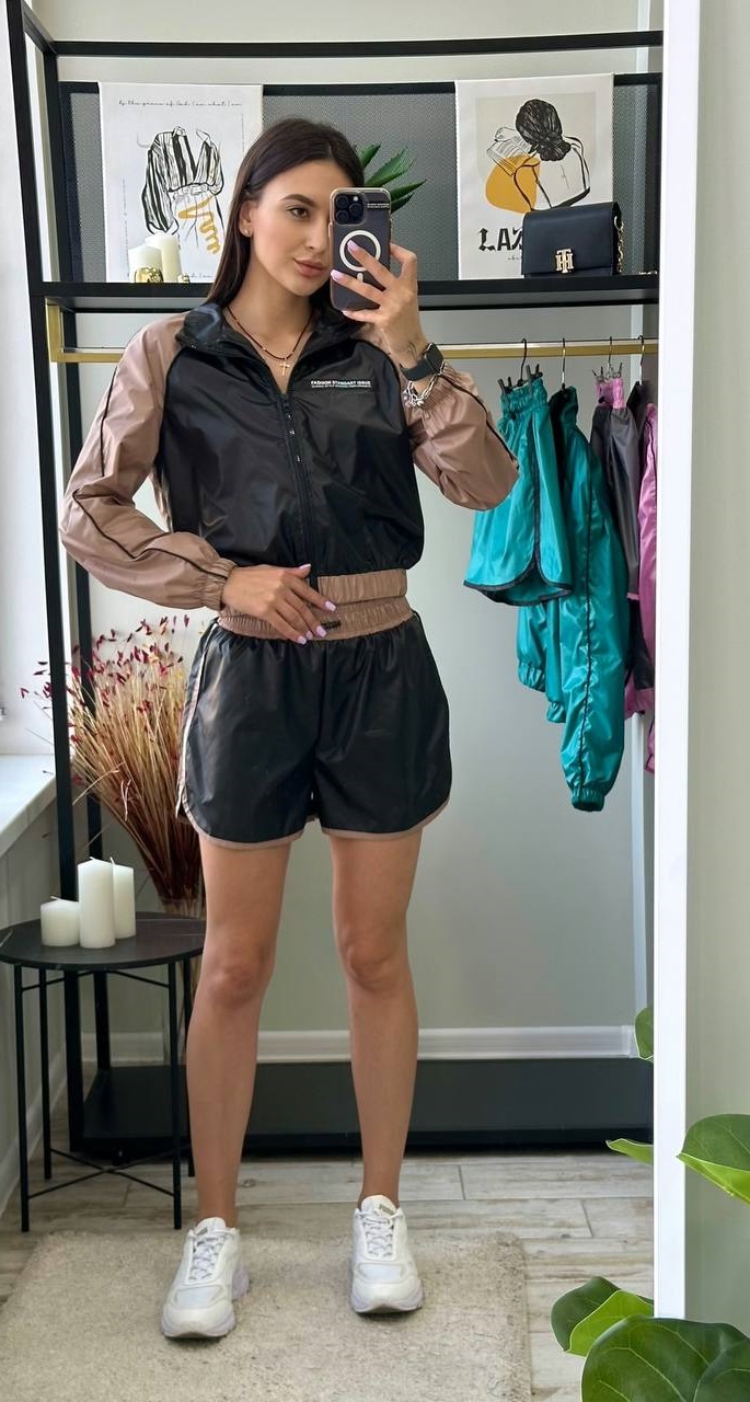 Головна » Магазин » Одяг » Жіночі костюми » Спортивный костюм из плащевки (ветровка+ шорты) черный/мокко