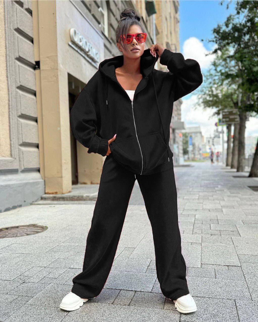 Головна » Магазин » Одяг » Жіночі спортивні костюми » Спортивный костюм (кофта на молнии с капюшоном+брюки свободного кроя) черный