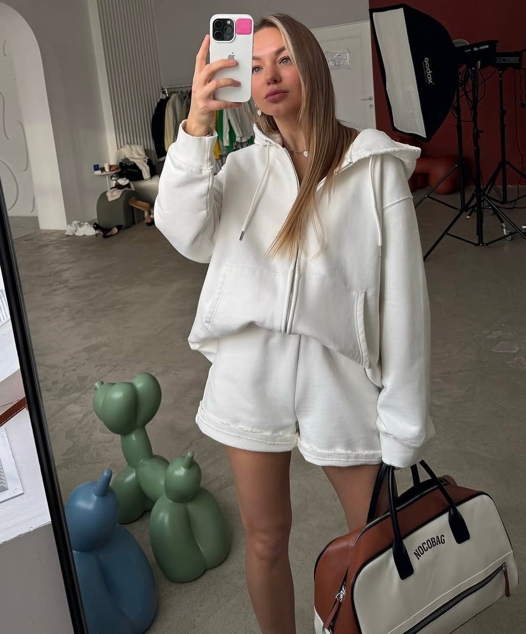 Головна » Магазин » Одяг » Жіночі спортивні костюми » Спортивный костюм (кофта на молнии с капюшоном+шорты трикотаж петля молочный