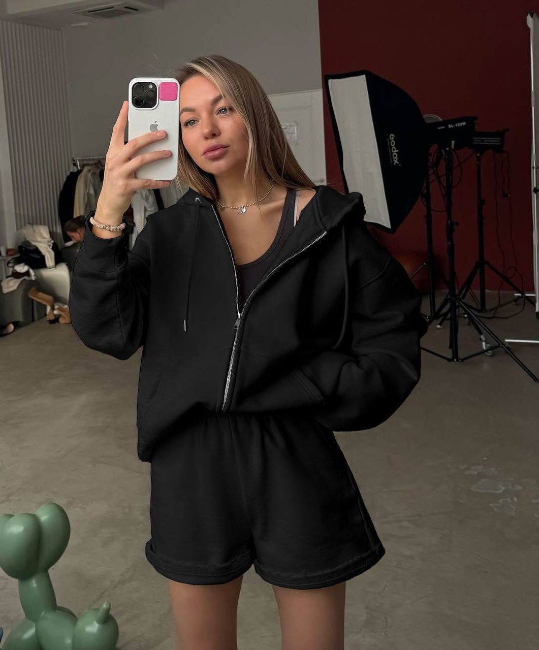 Головна » Магазин » Одяг » Жіночі спортивні костюми » Спортивный костюм (кофта на молнии с капюшоном+шорты трикотаж петля черный