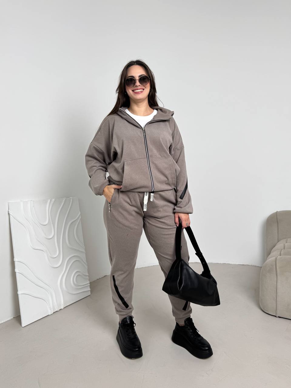 Спортивный костюм: Кофта на молнии с карманы кенгуру+Брюки высокая посадка мокко