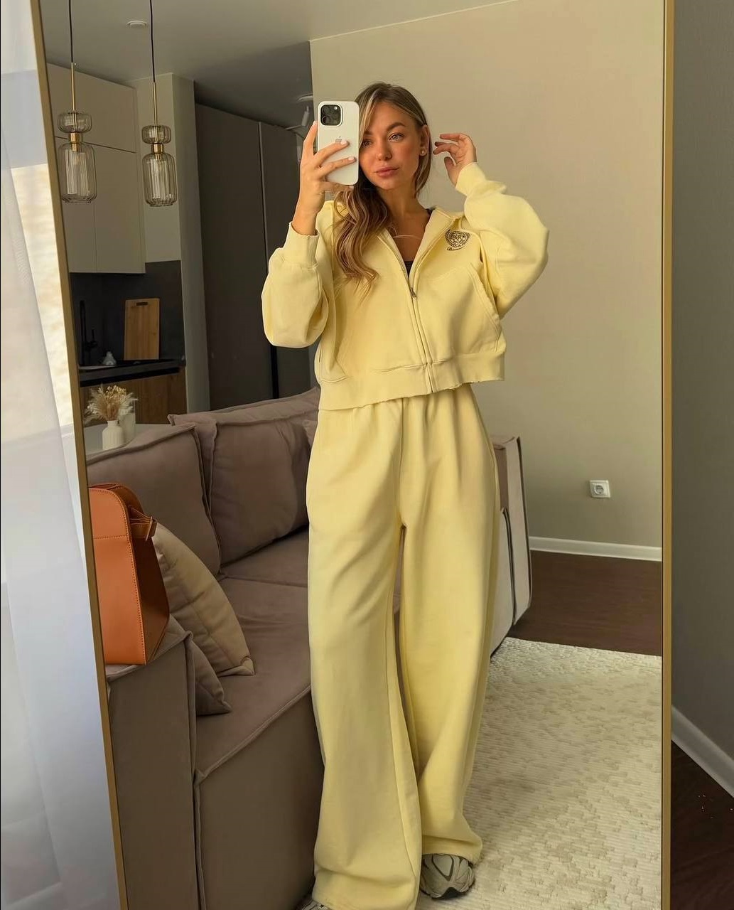 Спортивный костюм (кофта на молнии с накатом+капюшоном+свободные брюки) желтый