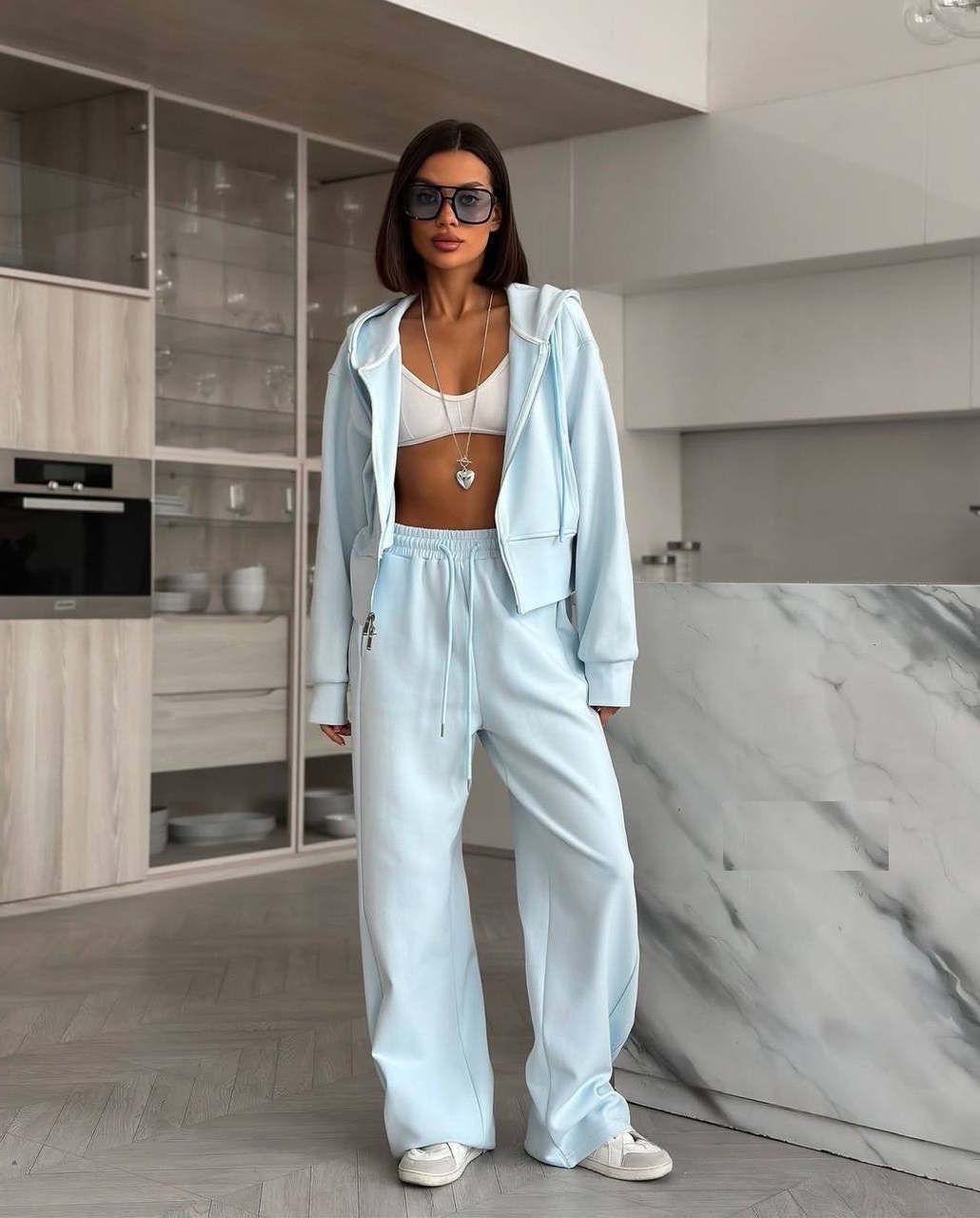Головна » Магазин » Одяг » Жіночі спортивні костюми » Спортивный костюм (кофта с капюшоном на молнии+свободные брюки) голубой