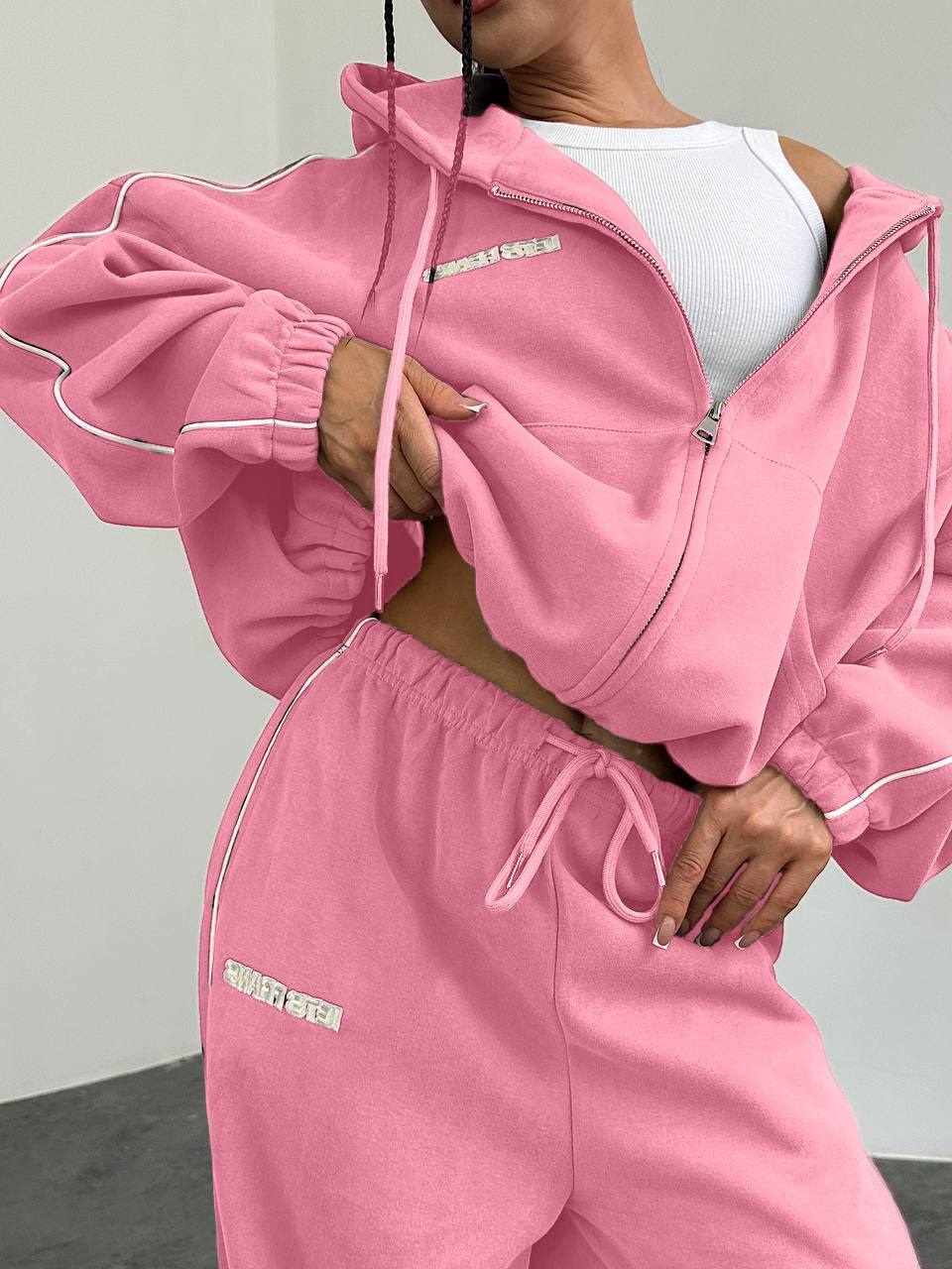Спортивный костюм с вставкой канта (брюки свободного кроя по низу затяжки+кофта укороченная) барби
