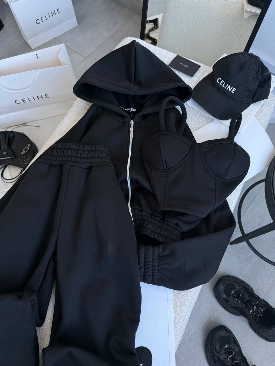 Будьте першим, хто залишив відгук “Спортивный костюм тройка (Худи oversize на молнии +топ+свободные брюки) черный”“