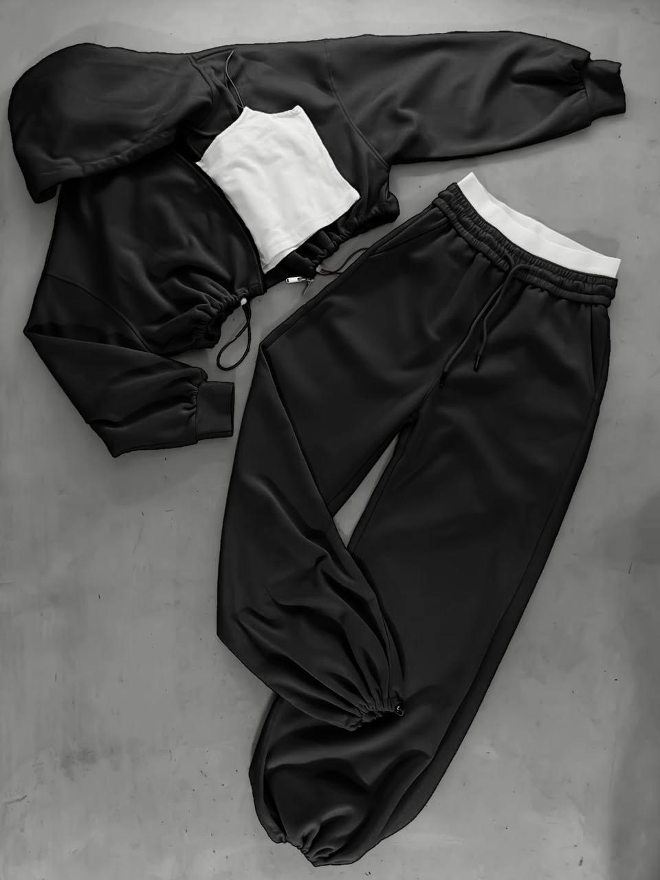 Будьте першим, хто залишив відгук “Спортивный прогулочный костюм 3-ка: укороченная кофта+топ+объемные брюки черный”“