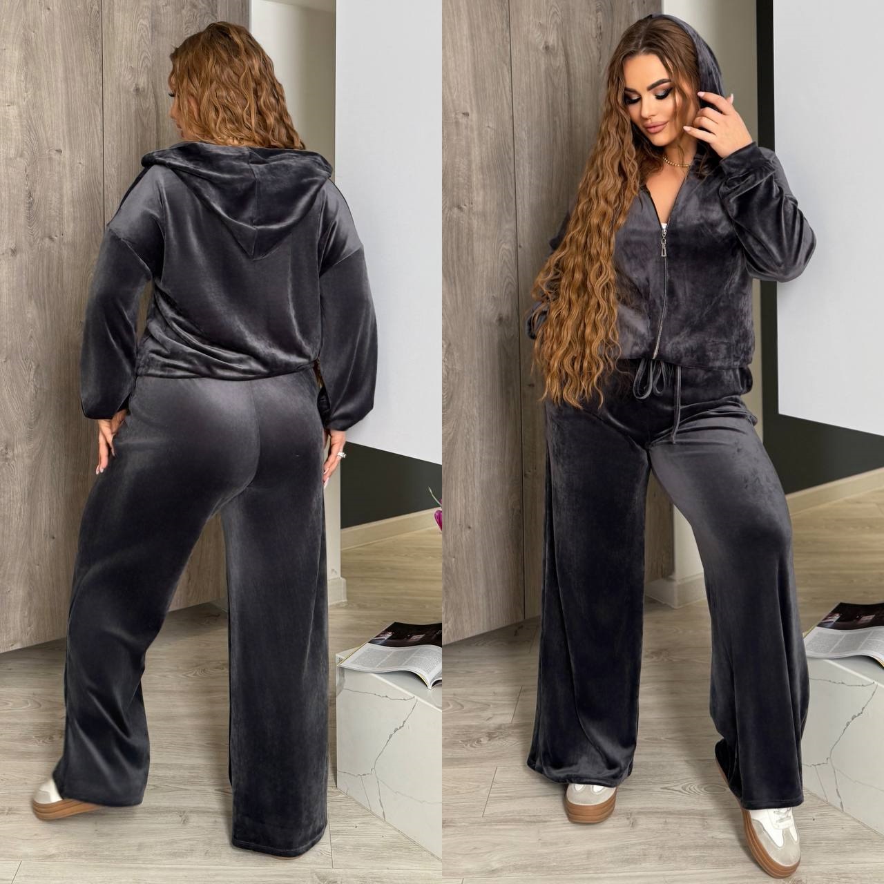 Спортивный велюровый костюм (кофта на молнии с капюшоном+широкие брюки) графит