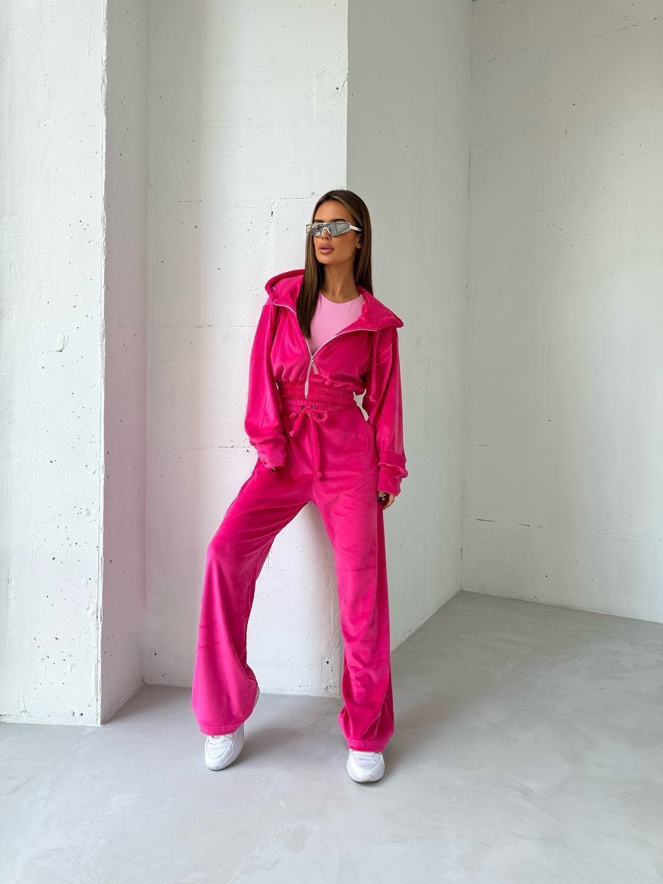 Кофта укорочена, на молнии. Брюки прямые, на резинке + высокая посадка.
