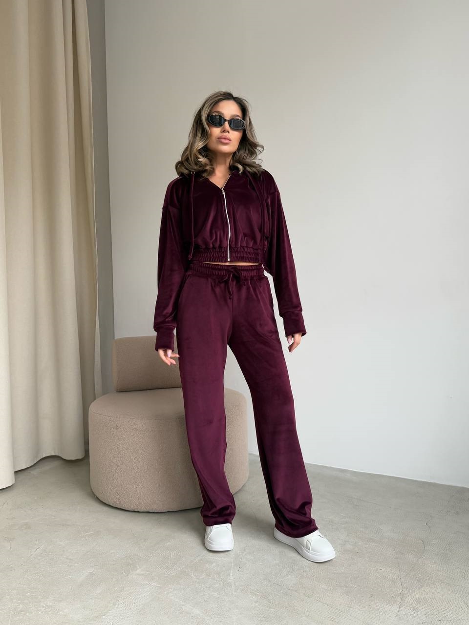 Кофта укороченная, на молнии. Брюки прямые, на резинке, с высокой посадкой.